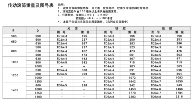 傳動(dòng)滾筒表面有裸露光鋼面,人字形和菱形花紋橡膠覆面。小功率、小帶寬及環(huán)境干燥時(shí)可采用裸露光鋼面。人字形花紋膠面摩擦系數(shù)大,防滑性和排水性好,但有方向性。菱形膠面用于雙向運(yùn)行的輸送機(jī)。